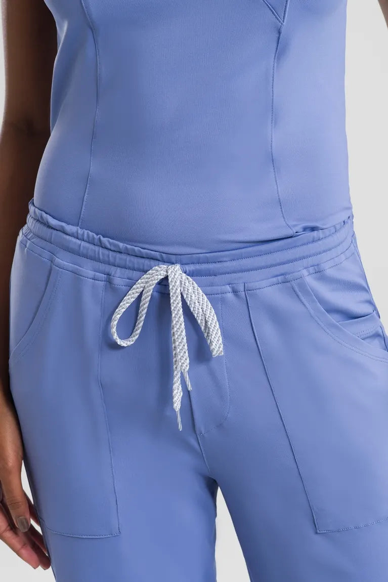 Su corte deportivo está diseñado para un ajuste perfecto, realzando un look moderno y profesional. El escote en V y los bolsillos inferiores de la parte superior garantizan funcionalidad y estilo. Los pantalones completan el conjunto con 9 bolsillos utilitarios delanteros y traseros, además de un ajuste cómodo con cinturilla elástica y cordones.